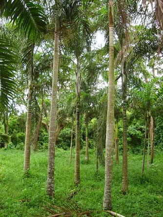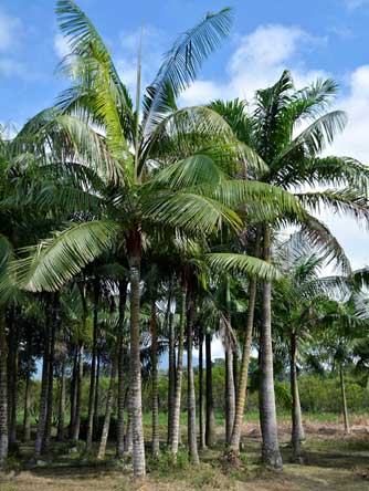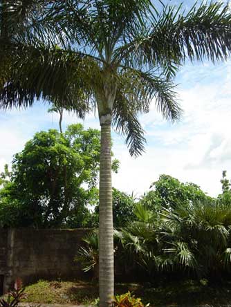 This naturalized ornamental palm tree originated from Queensland, Australia. The trunk is tall, gray to grayish brown in color and cospicuosly rigid. It has tiny flowers which are crem-colored followed by small, rounded, red fruits.