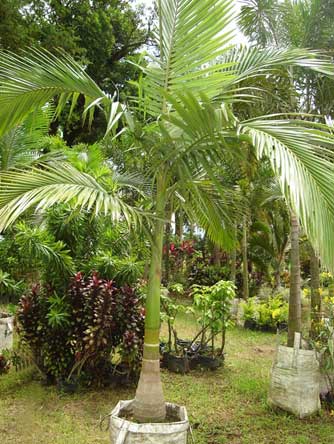 This solitary palm tolerates hot sun. It is suited to warm temperate zones. Most have distinctive swollen bases, all have feather-shaped fronds. Grows up to 6 meter in height with fronds of 1 to 2 meters in length. Very popular among Filipinos for landscaping, ideal for home gardens, parks and avenues.